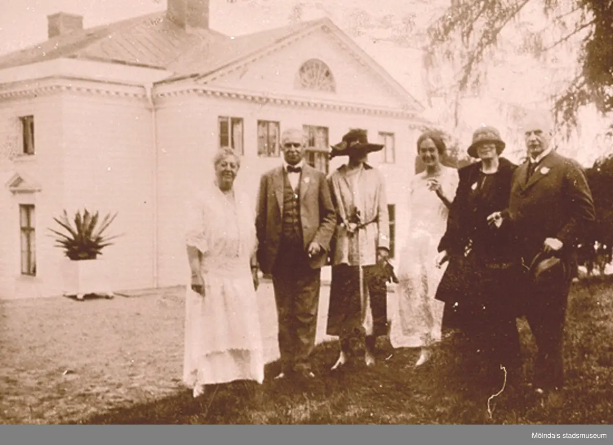 Internationellt pressbesök på Gunnebo slott den 22 juli 1923. Fyra kvinnor och två män står på Kejsareterrassen framför Gunnebo slott. Längst till vänster står friherrinnan Hilda Sparre. Påskrift: "Internationella pressbesöket".