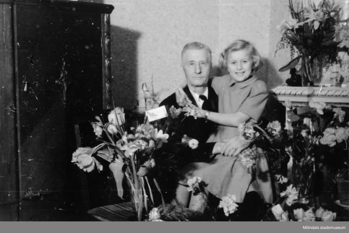 Högtidsdag och uppvakning för Claes Håkansson (kusk/chaufför). En av trotjänarna på Gunnebo slott. "Håkis" sitter med ett av sina barnbarn i knäet.