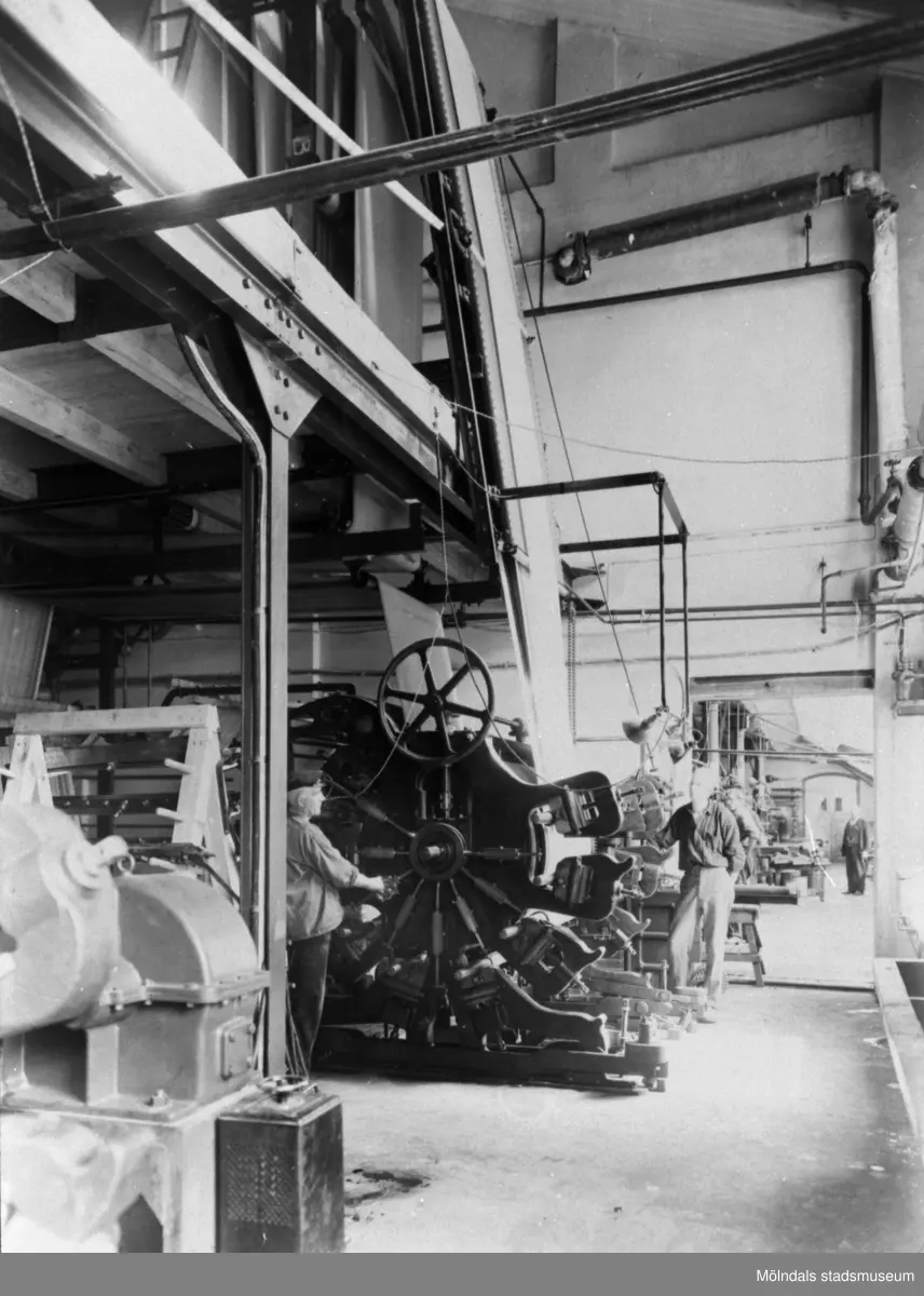 Färgtryckmaskin för tyg och väv som kunde trycka upp till 8 olika färger på tyget. Interiör från Krokslätts fabrik.