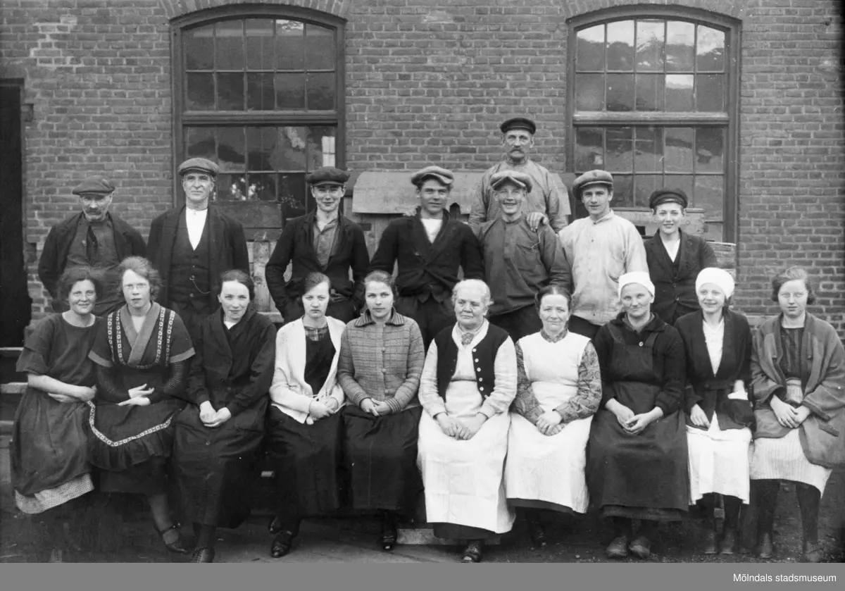 Väveriarbetare utanför Krokslätts fabriker, 1920-tal. Första raden: flickorna till vänster jobbade i solven, flickorna i mitten jobbade i läggrummet. Andra raden, tredje från vänster står bröderna Arnold och Gillbert Rosell, Knut Larsson, Conrad Dahl och Bergström. Längst bak står Håkansson på lagret.