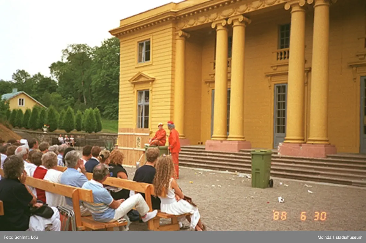 En grupp människor som sitter och tittar på två personer i en teaterföreställning på Gunnebo slotts framsida. Skådespelarna är iklädda oranga overaller och har två gröna soptunnor som rekvisita. Man ser det gula slottet till höger i bild.