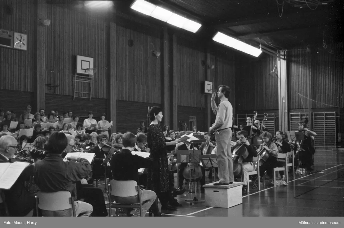 240 medverkande från Chalmers manskör, Collegium Musicum, Mölndals körsällskap, Mölndals vokalensemble, barnkör från Brattåsskolan, Göteborgs Ungdomssymfoniker, Mölndals Musiksällskap samt solister från Storan håller konsert på Ekenskolan i Kållered, år 1984. "Britt Louise Frandsen charmade publiken med sin vackra röst."