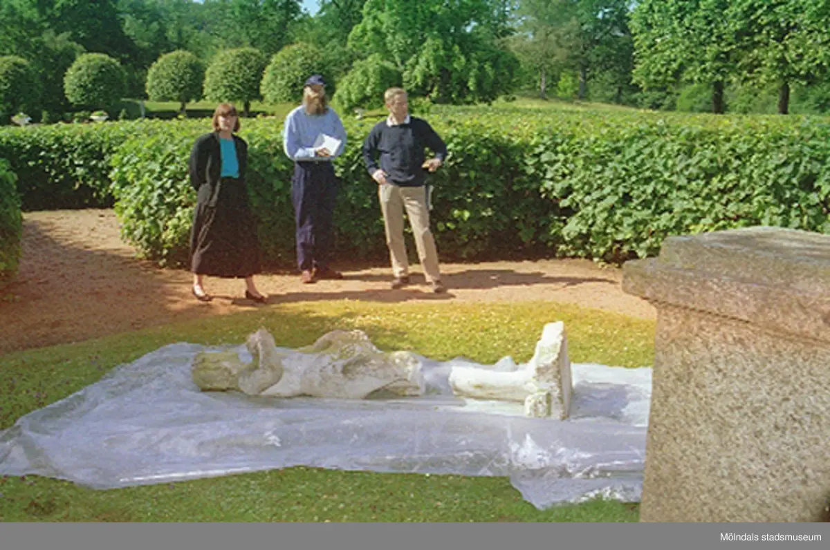 Museichef Mari-Louise Olsson, Antikvarie Lars Gahrn och Kultur- och fritids chef Karl Nordanstad beskådar skadade skulpturer. Dokumentation av sönderslagna skulpturer Bacchus och Flora, Gunnebo slott juni 1993.