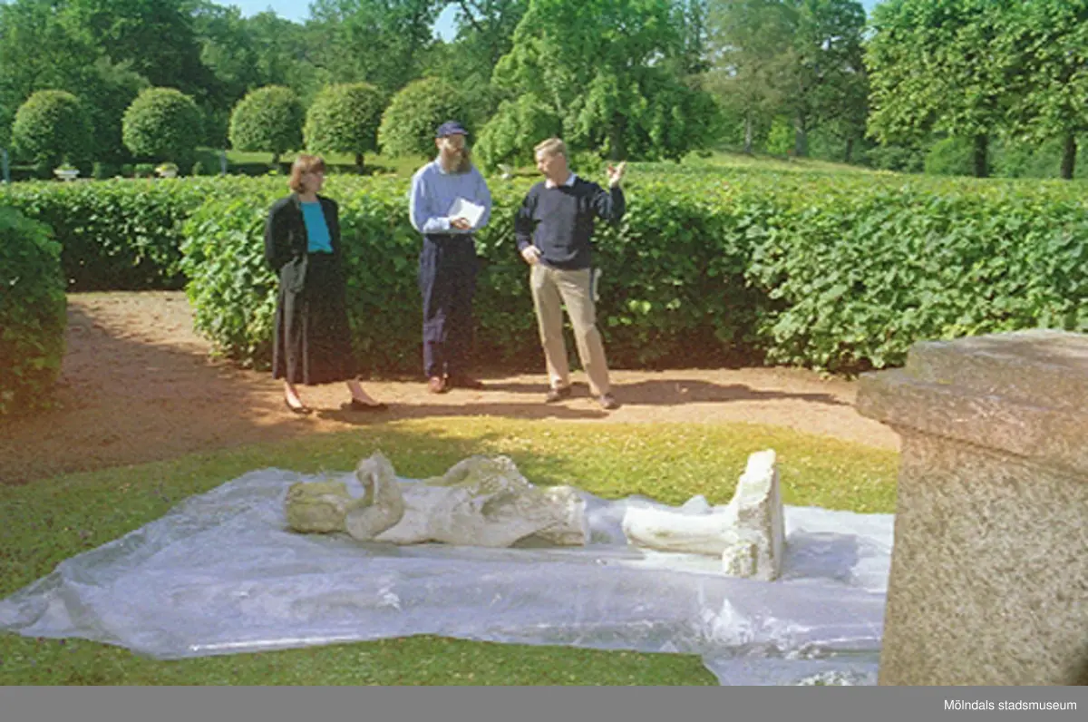 Museichef Mari-Louise Olsson, Antikvarie Lars Gahrn och Kultur- och fritids chef Karl Nordanstad beskådar skadade skulpturer. Dokumentation av sönderslagna skulpturer Bacchus och Flora, Gunnebo slott juni 1993.