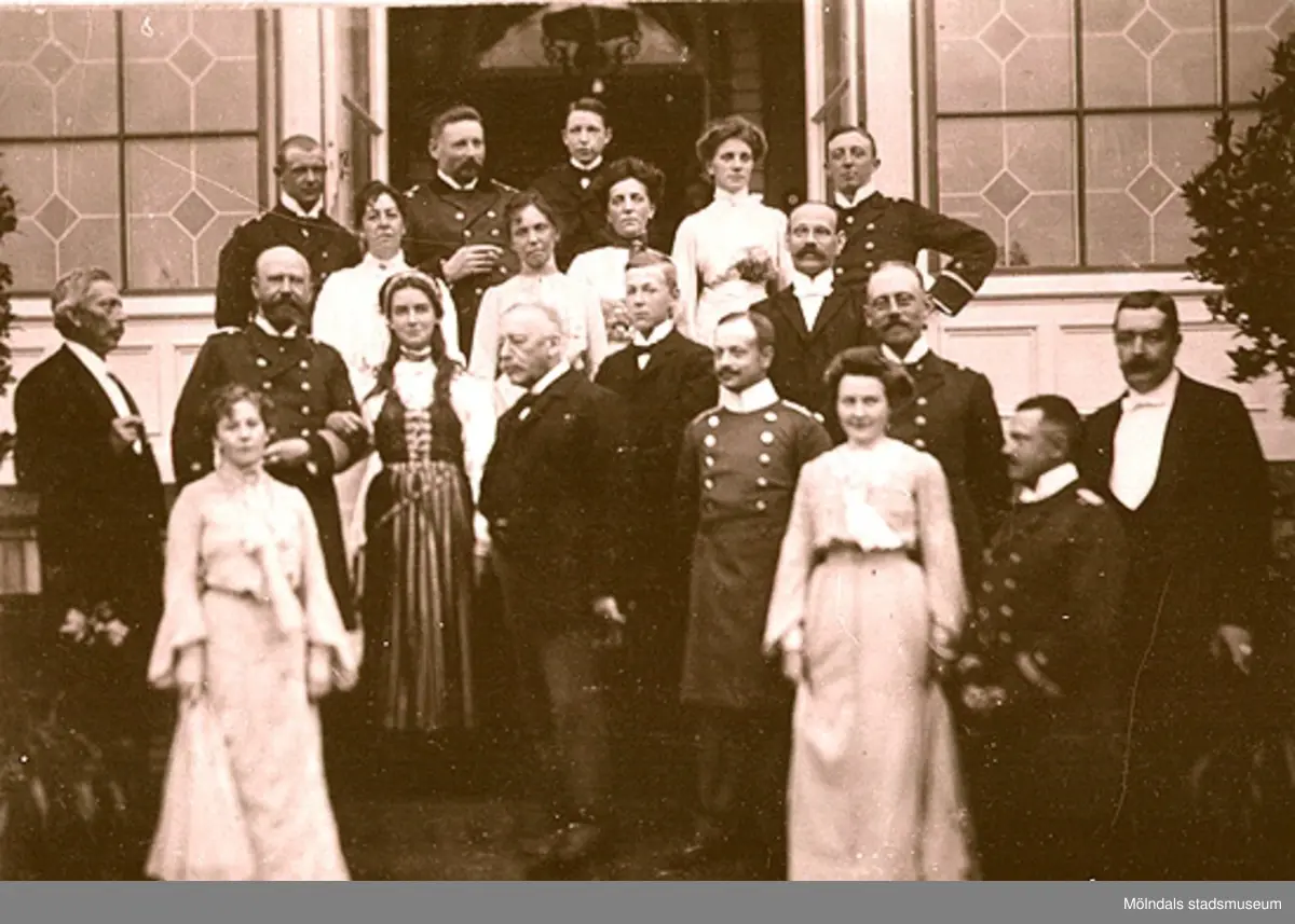 "Middag för tyska sjöofficerare". Den äldre mannen längst fram i mitten torde vara F.W. Denninghoff. Längst till höger står hans svärson friherre Carl Sparre. År 1902.
