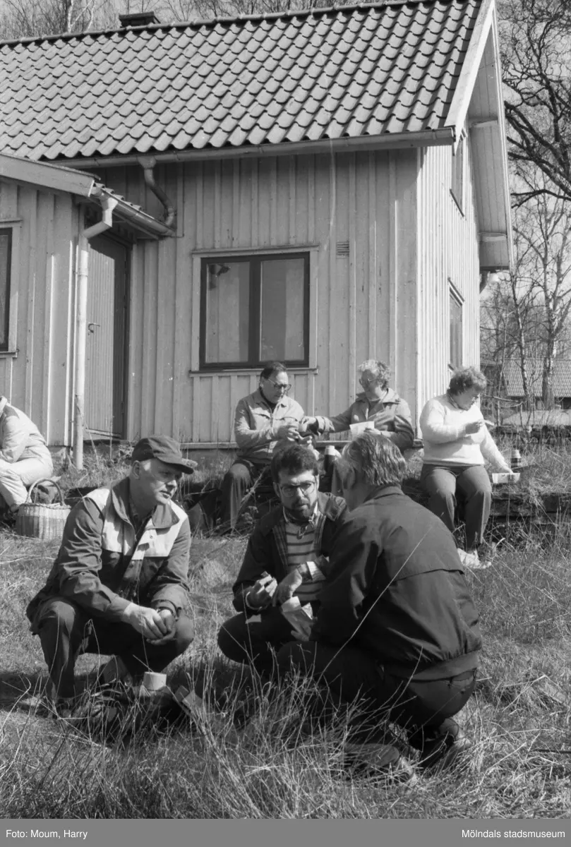 Kållereds hembygdsgille anordnar sockenvandring i området vid Kållereds kyrka, år 1984. Hembygdsgillet vid klockargården i Backered.