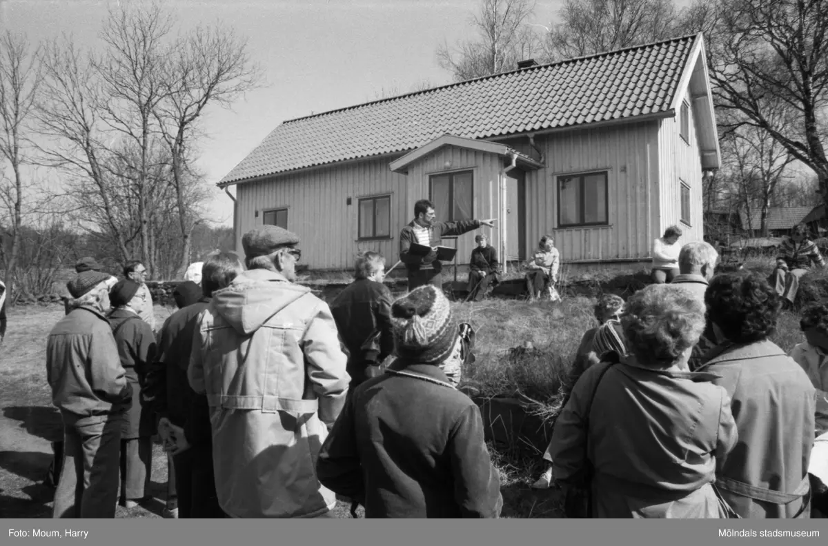 Kållereds hembygdsgille anordnar sockenvandring i området vid Kållereds kyrka, år 1984. Hembygdsgillet vid klockargården i Backered.