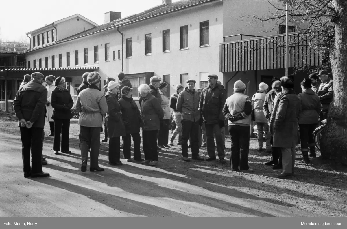 Kållereds hembygdsgille anordnar sockenvandring i Torrekulla, Kållered, år 1984. Här vid Torrekulla turiststation.