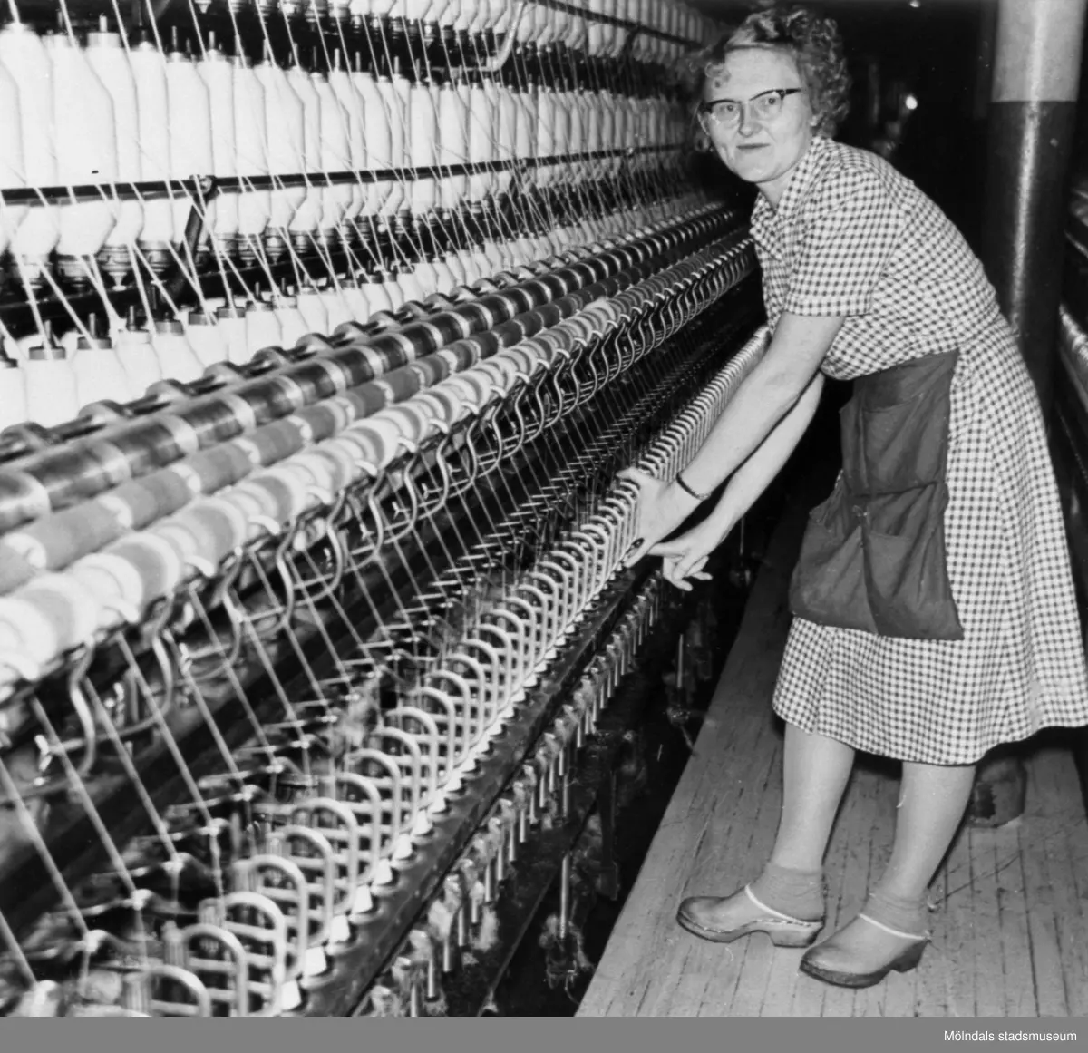 Leida Jerkeskog arbetar vid en spinnerimaskin på Krokslätts fabrik, 4:e våningen, 1958.