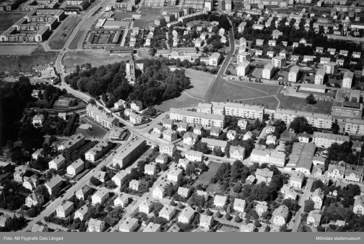 Flygfoto taget 1962 över Broslätt, Mölndalsbro och Fässbergs kyrka. Man ser delar av Broslättsgatan, Frölundagatan och Tempelgatan samt Storgatan, Villagatan och Nygatan. I bakgrunden ses Bosgården och Toltorp. Längst upp till vänster ses lägenheterna på Lerbrännargatan.