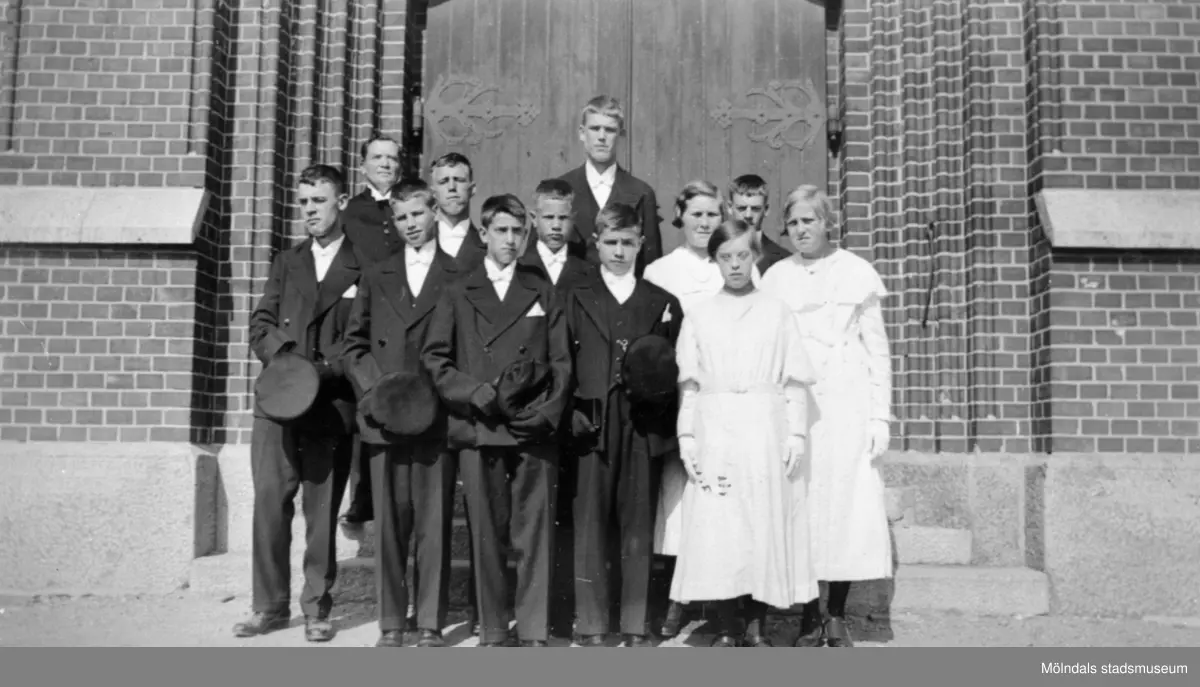 En konfirmandgrupp från Stretereds skolhem fotograferade framför porten till Fässbergs kyrka. Årtal okänt.