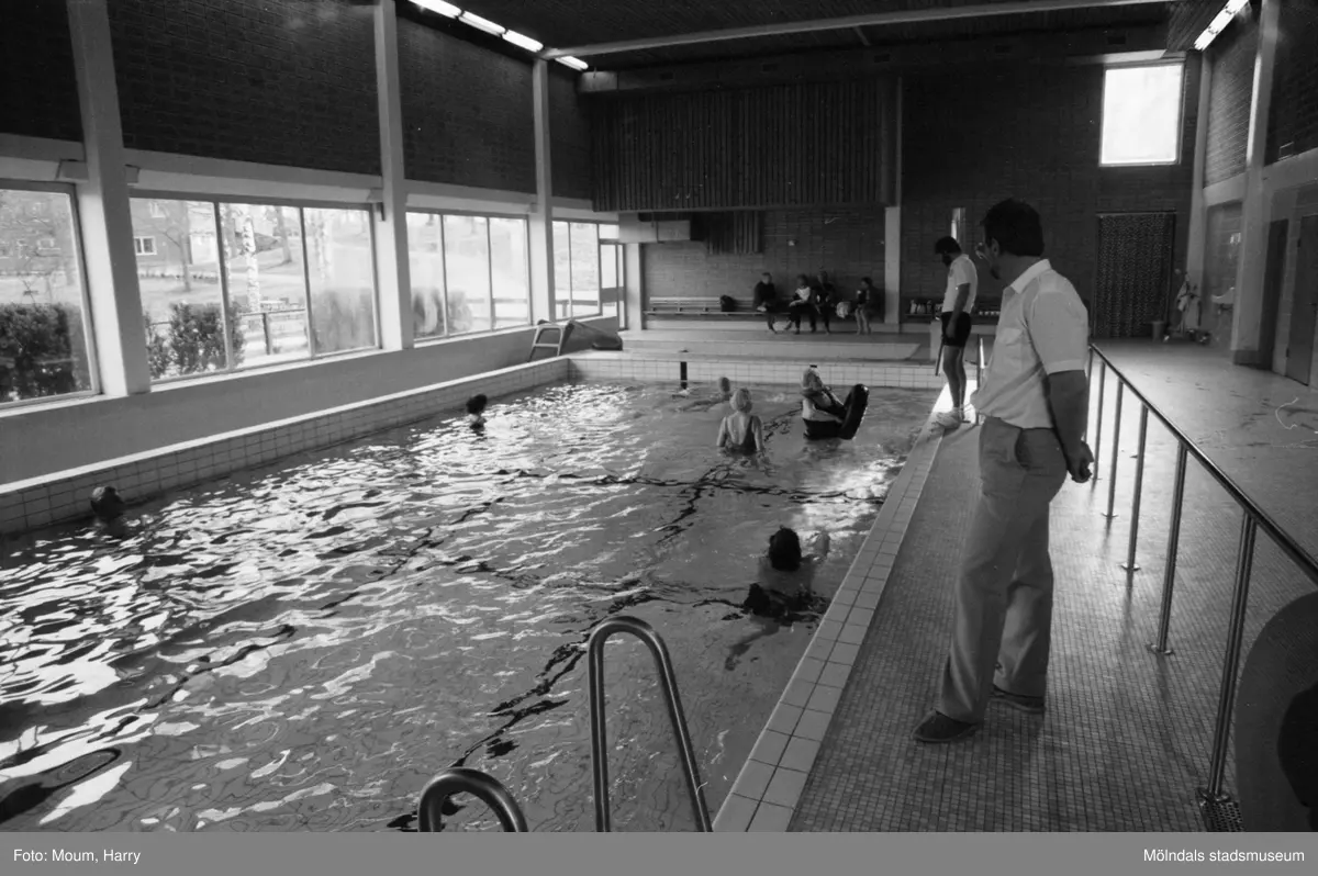 Invigning av handikappbadet på Stretered i Kållered, år 1984. En samling människor som simmar. "Nu har de rörelsehindrade fått möjligheter att bada vid Stretered."