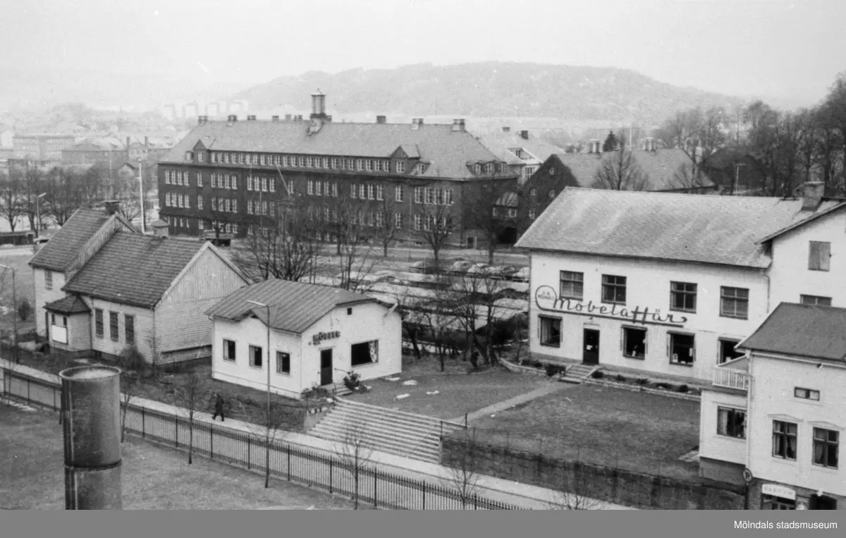 Kvarnbygatan och Allén har fotograferas från Papyrus, 1960- 70-tal. I förgrunden ses Frälsningsarmén (Kvarnbygatan 19, idag: Kvarnbygatan 6), Victor Malmbergs ateljé (Kvarnbygatan 21) och Eneborgs (Kvarnbygatan 23), Mölndals möbelaffär (Trädgårdsgatan 3). I bakgrunden ses Kvarnbyskolan på Allén 9.