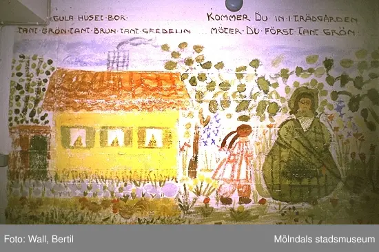 Teckningar gjorda av barn, 4-6 år, på Toltorpsdalens lekskolor, för utsmyckning av Lackarebäckshemmet. Motiven är hämtade ur olika välkända sagor som Arosenius "Kattresan", Elsa Beskows sagor om "Tant Brun, Tant Grön och Tant Gredelin" och "Tomtebobarnen". Relaterade motiv: 2004_1016 - 1025.
