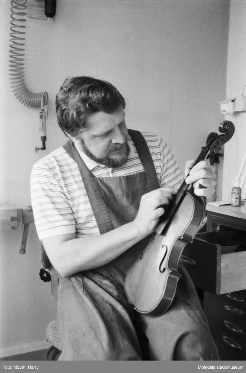 Carlo Hansen flyttar sin fioltillverkning till Kållered, år 1984. "Kenneth Eriksson, Lindome, nyanställd hos makarna Hansen är noga med att få fram träets lyster."