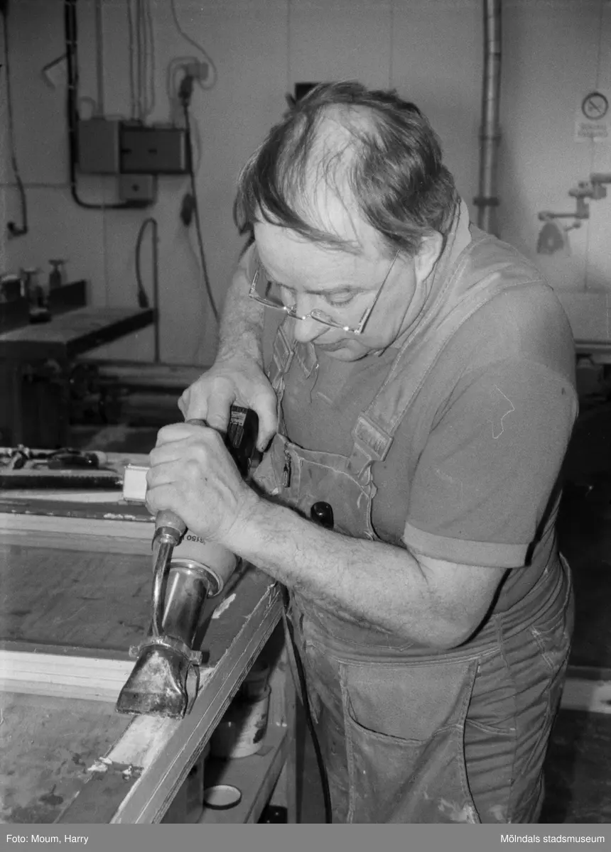 Lindome Snickeri vid Gamla Riksvägen i Kållered, år 1985. "Lars Inge Hult visar hur man med en specialapparat snabbt tar bort allt gammalt kitt."