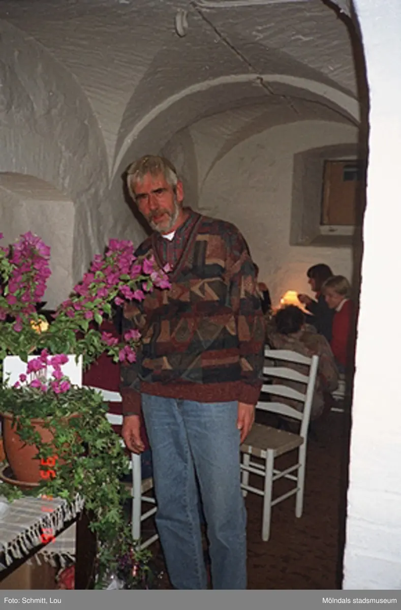 Ove Höglund står bredvid ett bord fullt med blommor. Detta i samband med avtackningen av Johan och Anna-Greta Ryhag. De hade deltagit som frivilligarbetare i utgrävningarna på Gunnebo slott under ledning av arkeolog Lou Schmitt. November 1995.