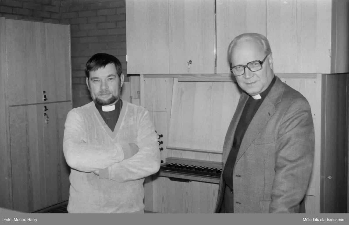 Nybyggda Fågelbergskyrkan i Rävekärr, Mölndal, år 1984. "Komminister Jan Merje och kyrkoherde Olof Dotevall är nöjda med den nya kyrkan."