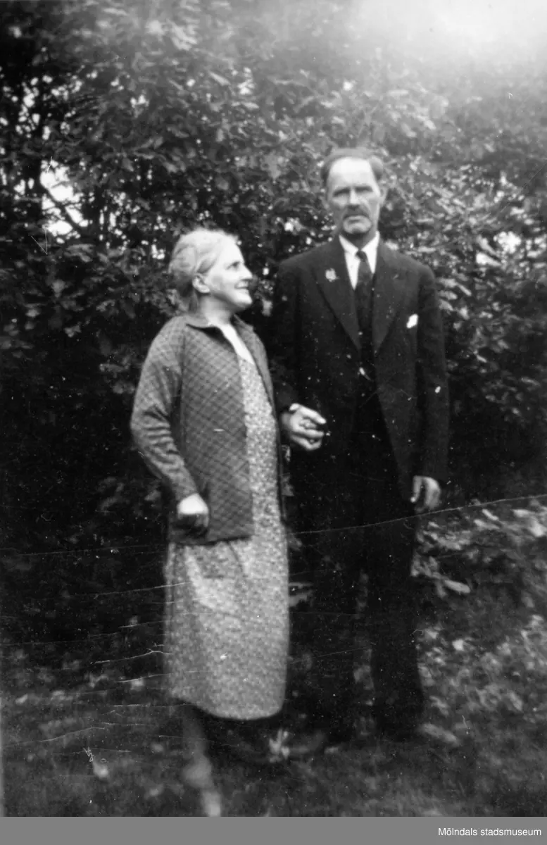 Viktoria "Vickan" (anställd 1904-1921) och maken Karl August (anställd 1903-1949) Lindblom står i Gunnebo slottsträdgård, 1910-tal.