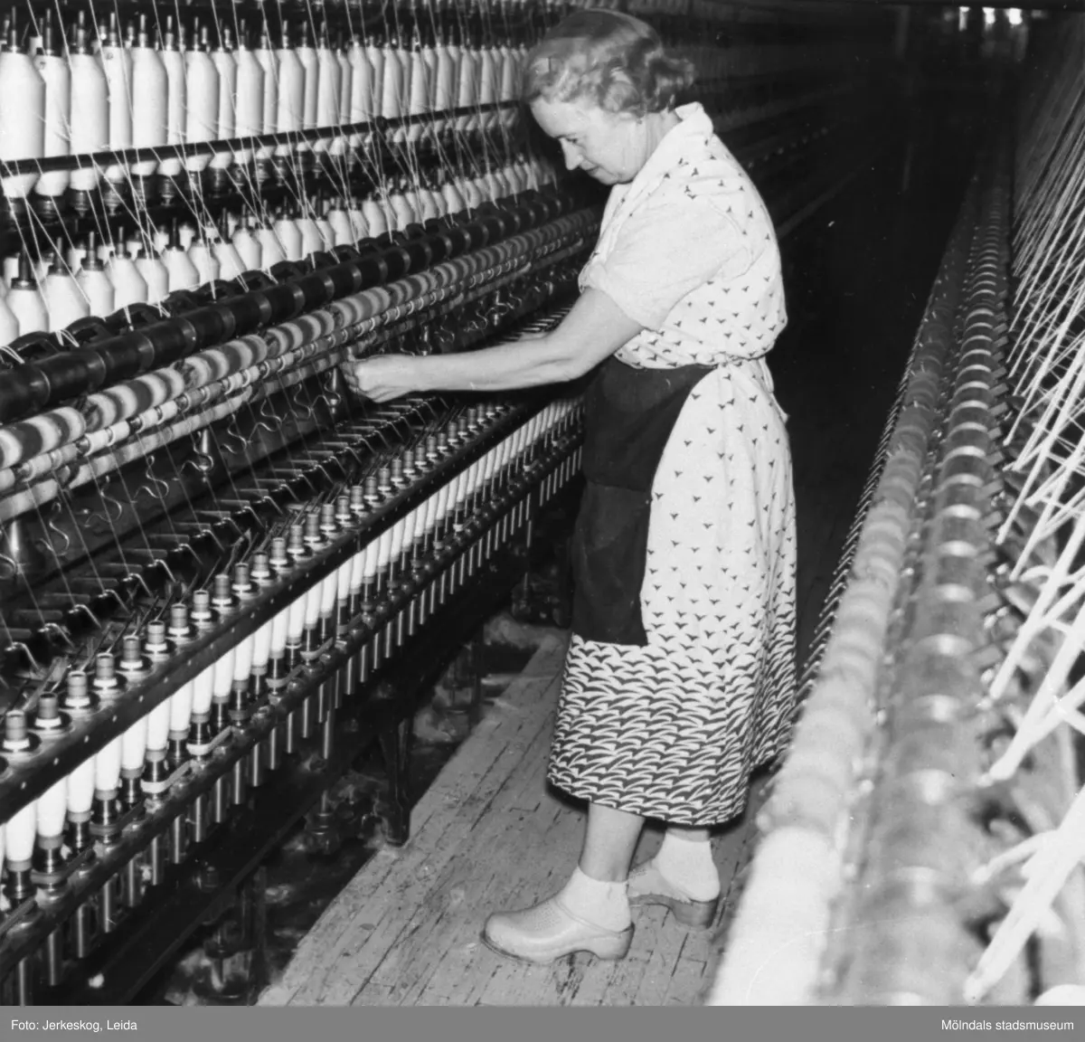 Elsa Säfström arbetar vid en spinnerimaskin på Krokslätts fabriker 1958.
