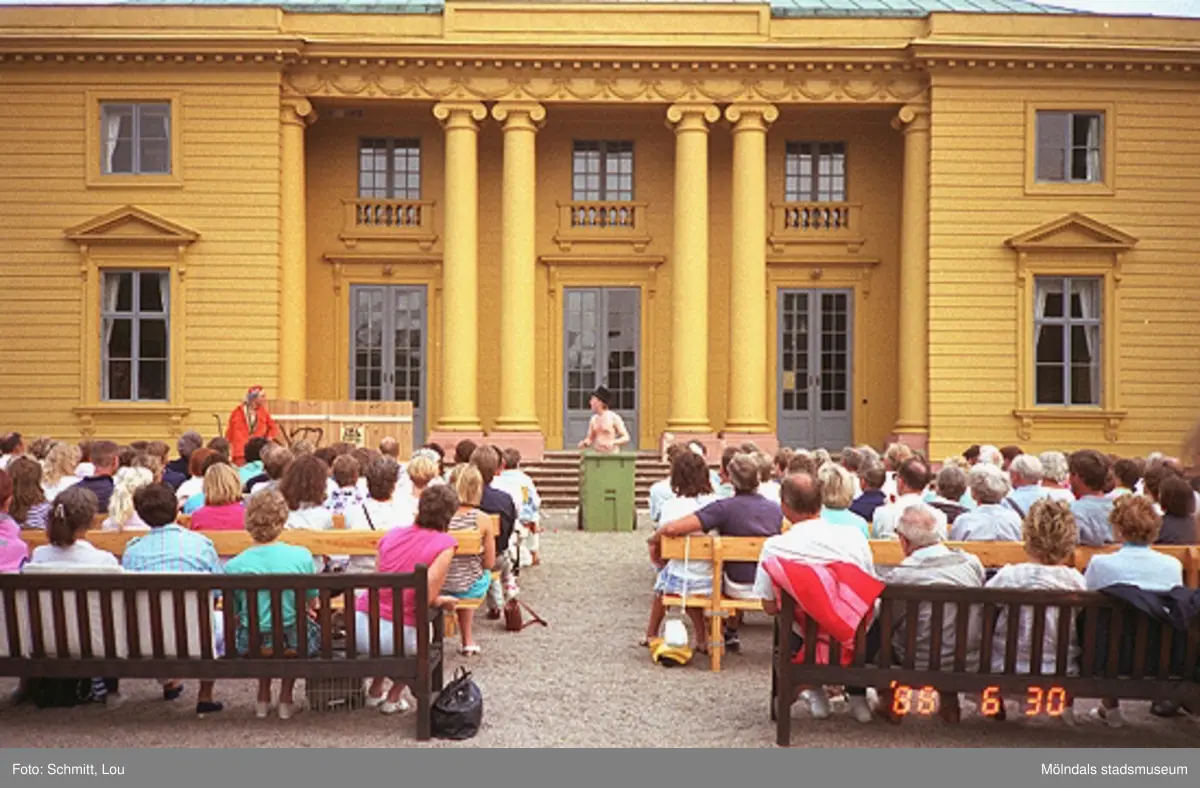 Människor som sitter och tittar på en teaterföreställning på framsidan av Gunnebo slott. En skådespelare, iklädd en svart hatt och bar överkropp, håller händerna ovanför en grön soptunna. Till vänster står en anann skådespelare i orange overall.
