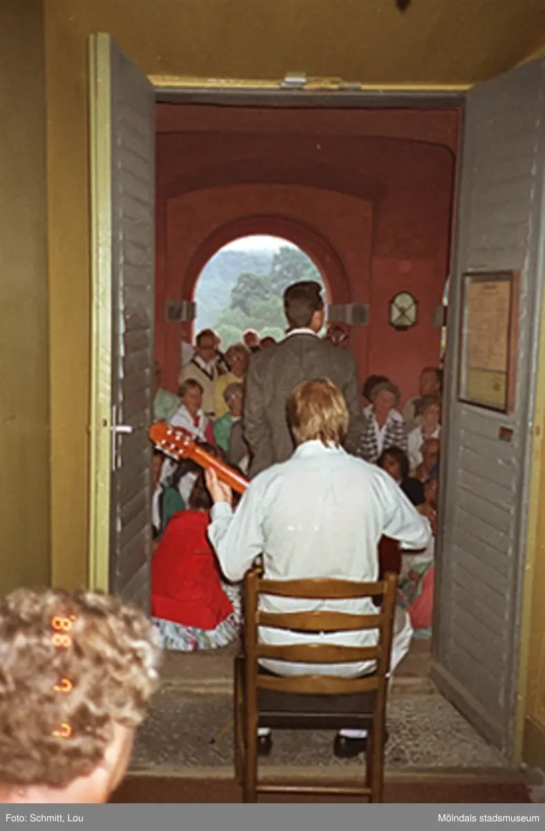 En man, sittandes på en stol med ryggen åt fotografen, spelar gitarr. Framför honom står en man och sjunger. Publiken sitter både framför och bakom dem. Samtliga befinner sig inomhus i en slags hall, så det är smalt och trångt.