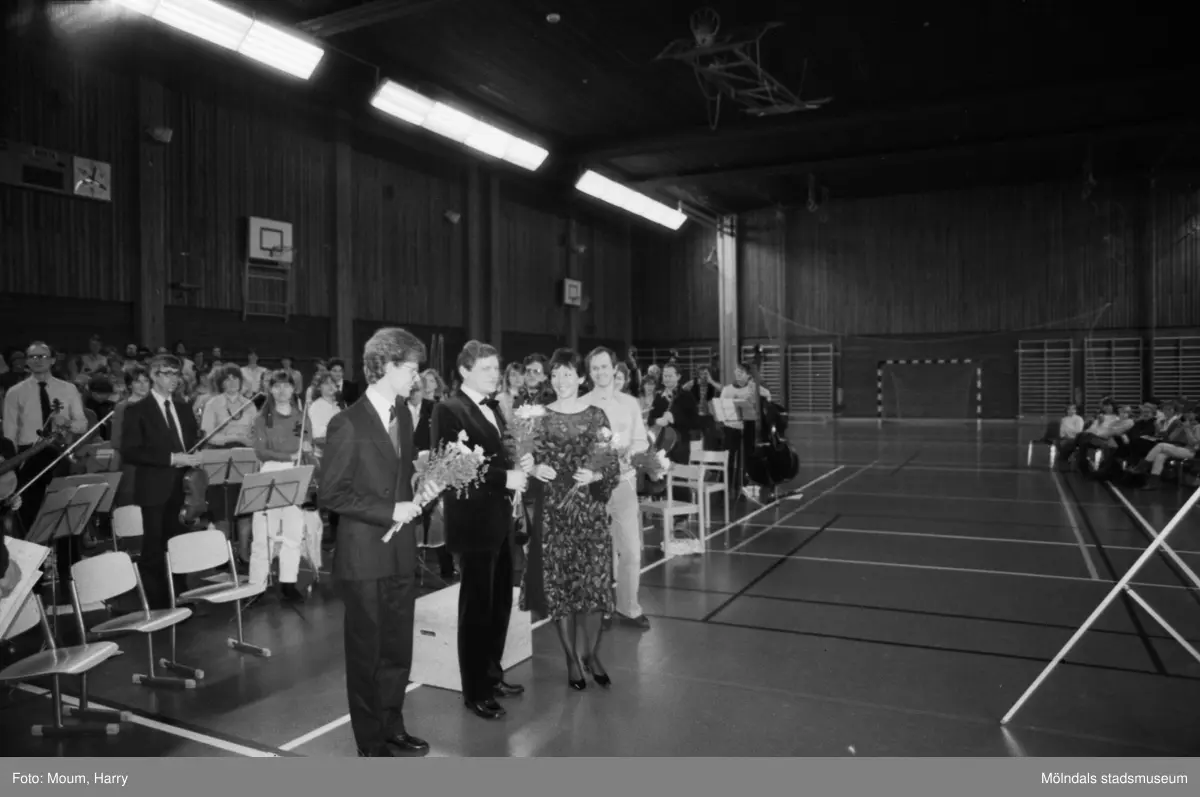 240 medverkande från Chalmers manskör, Collegium Musicum, Mölndals körsällskap, Mölndals vokalensemble, barnkör från Brattåsskolan, Göteborgs Ungdomssymfoniker, Mölndals Musiksällskap samt solister från Storan håller konsert på Ekenskolan i Kållered, år 1984.
