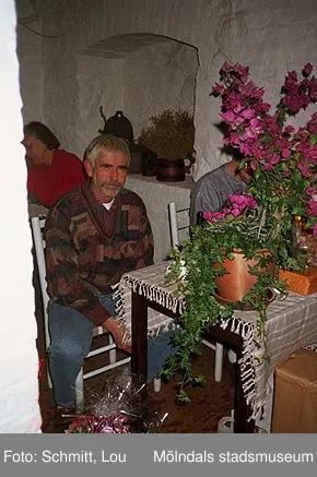 Ove Höglund sitter vid ett bord som är fullt med blommor. Detta i samband med avtackningen av Johan och Anna-Greta Ryhag. De hade deltagit som frivilligarbetare i utgrävningarna på Gunnebo slott under ledning av arkeolog Lou Schmitt. November 1995.