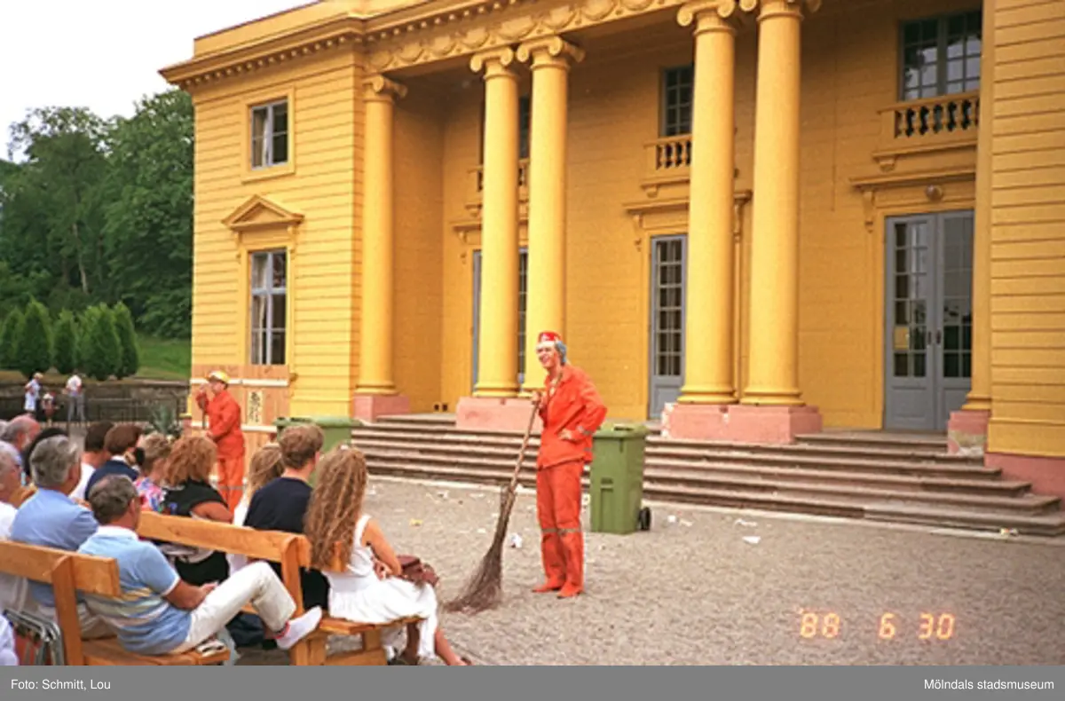 En grupp människor som sitter och tittar på två personer i en teaterföreställning på Gunnebo slotts framsida. Skådespelarna är iklädda oranga overaller och har två gröna soptunnor som rekvisita. Man ser en del av det gula slottet till höger i bild.