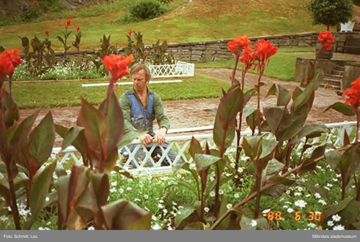 En man som blir fotograferad genom en blomsterrabatt i Gunnebo slottspark. Han har precis lagat ett vitt staket som står framför rabatten och håller nu i detta. I bakgrunden ser man fler rabatter samt en gräsbeväxt kulle.