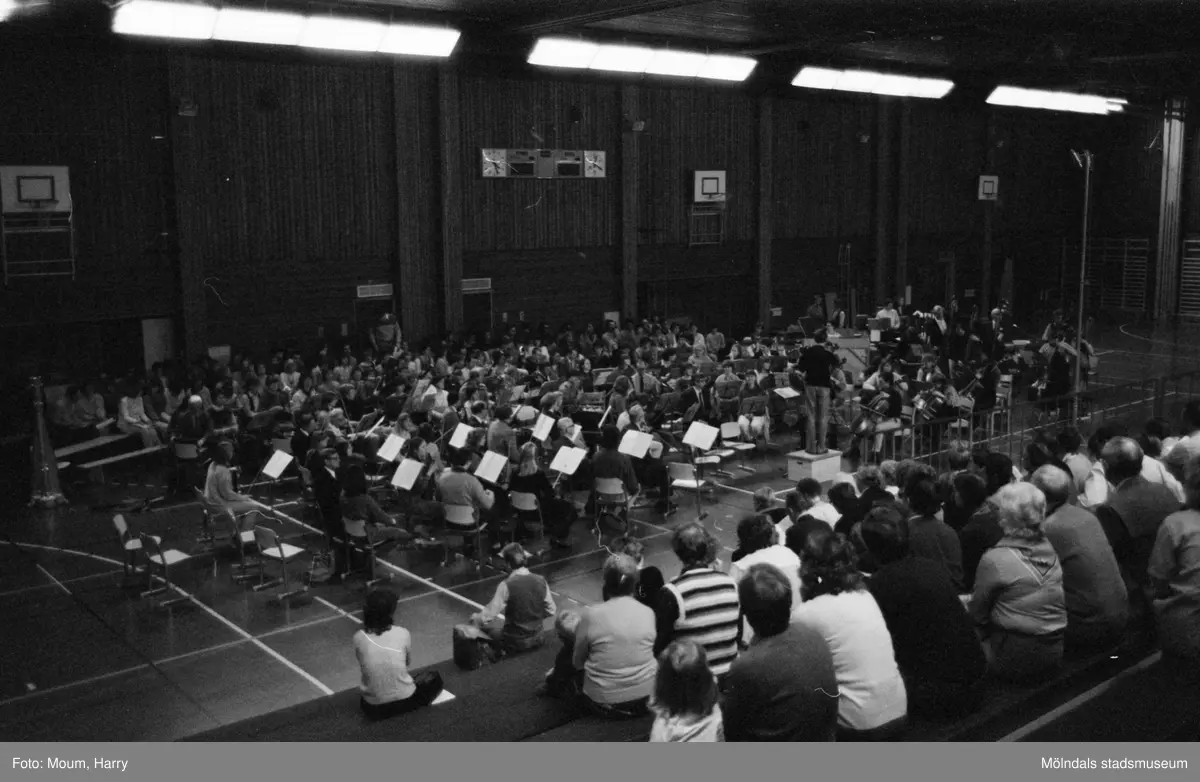 240 medverkande från Chalmers manskör, Collegium Musicum, Mölndals körsällskap, Mölndals vokalensemble, barnkör från Brattåsskolan, Göteborgs Ungdomssymfoniker, Mölndals Musiksällskap samt solister från Storan håller konsert på Ekenskolan i Kållered, år 1984.