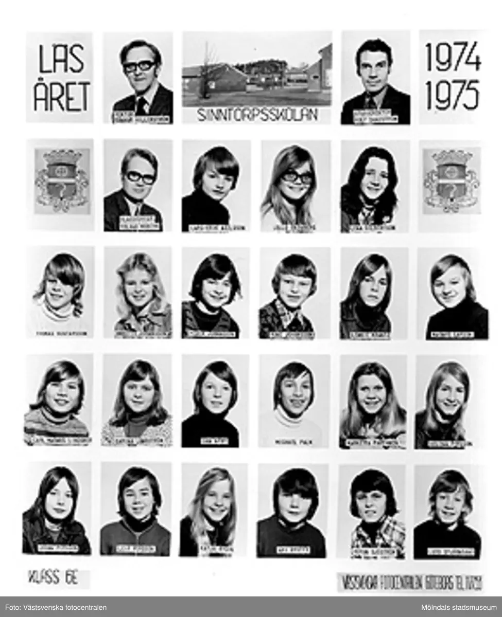 En bildkarta med skolfoton på klass 6E i Sinntorpsskolan, läsåret 1974/1975. Bildkartan är uppklistrad på ett fotoark i en pärm (MM23916) från Brattås rektorsområde, tillsammans med andra skolfoton MMF2004_1484-1522.