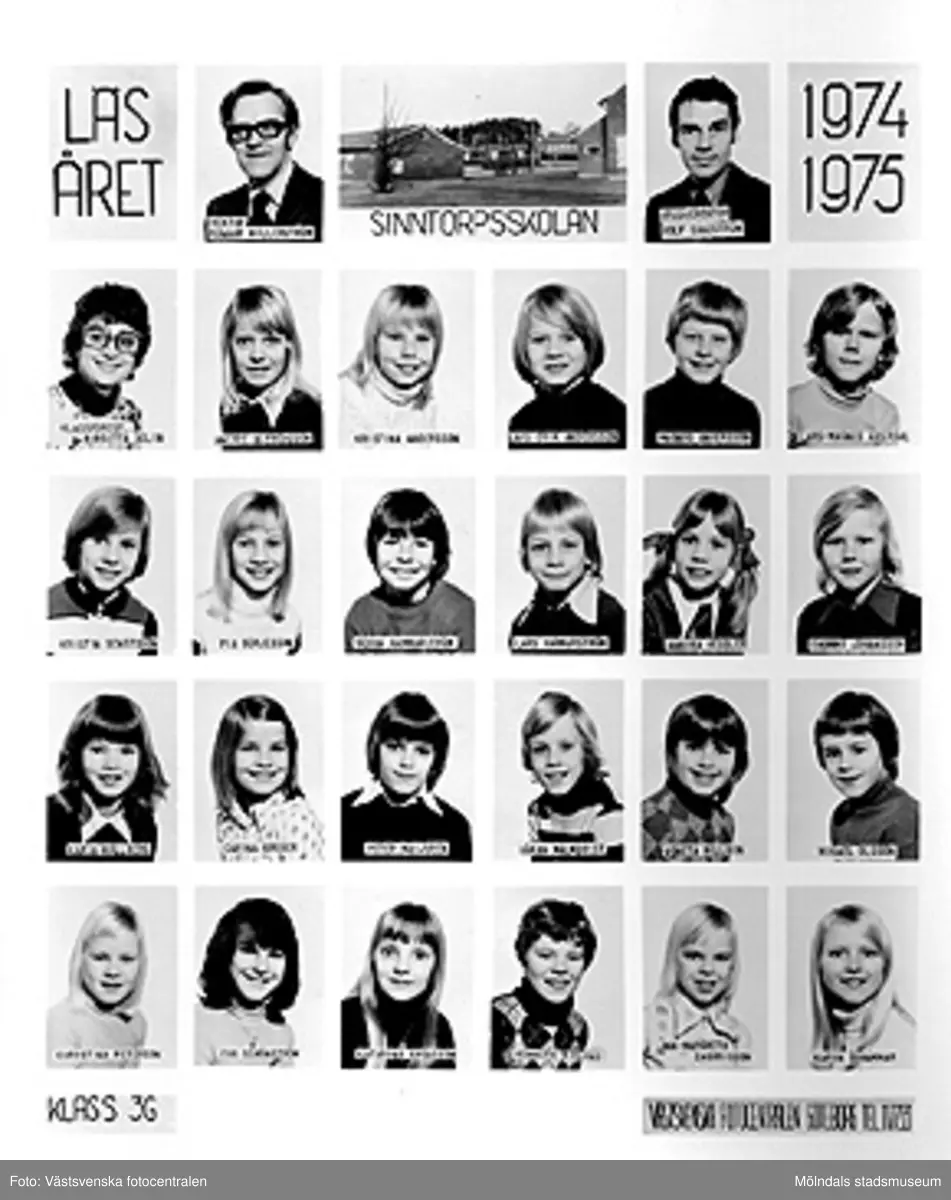 En bildkarta med skolfoton på klass 3G i Sinntorpsskolan, läsåret 1974/1975. Bildkartan är uppklistrad på ett fotoark i en pärm (MM23916) från Brattås rektorsområde, tillsammans med andra skolfoton MMF2004_1484-1522.