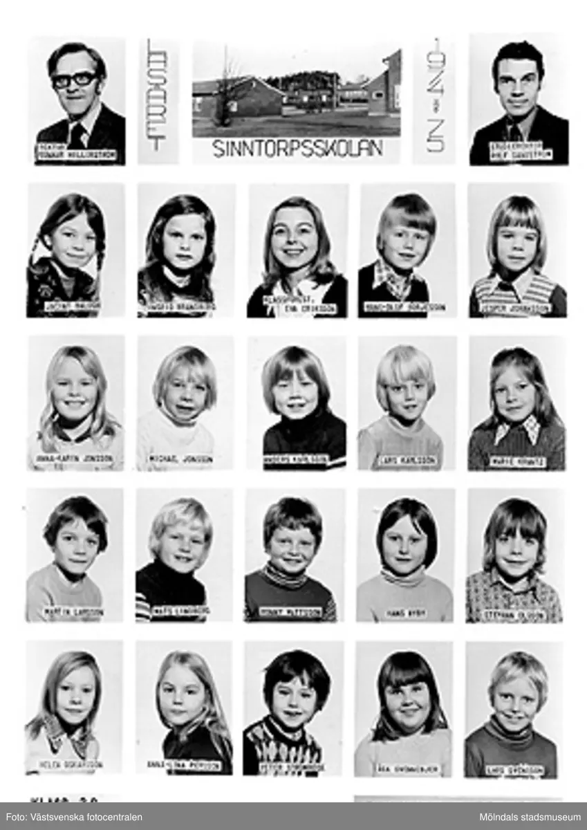 En bildkarta med skolfoton på klass 2G i Sinntorpsskolan, läsåret 1974/1975. Bildkartan är uppklistrad på ett fotoark i en pärm (MM23916) från Brattås rektorsområde, tillsammans med andra skolfoton MMF2004_1484-1522.