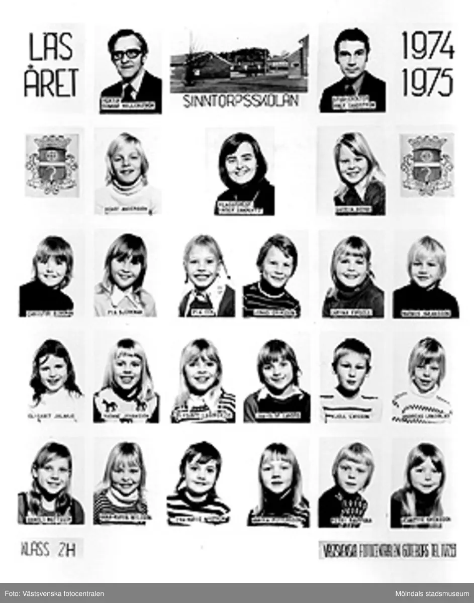 En bildkarta med skolfoton på klass 2H i Sinntorpsskolan, läsåret 1974/1975. Bildkartan är uppklistrad på ett fotoark i en pärm (MM23916) från Brattås rektorsområde, tillsammans med andra skolfoton MMF2004_1484-1522. Rektor Gunnar Hillerström, Studierektor Rolf Sandström, Bengt Andersson, Klassföreståndare Inger Sandqvist, Catrin Bergh, Christer Bergman, Pia Björkman, Pia Eek, Jonas Eriksson, Carina Forsell, Magnus Håkansson, Elisabet Jalakas, Yvonne Johansson, Elisabet Lagerqvist, Jan-Olof Lambro, Kjell Larsson, Andreas Lundblad, Anneli Mattsson, Anna-Karin Nilsson, Eva-Marie Nyström, Annika Pettersson, Petri Raappana, Jeanette Svensson.