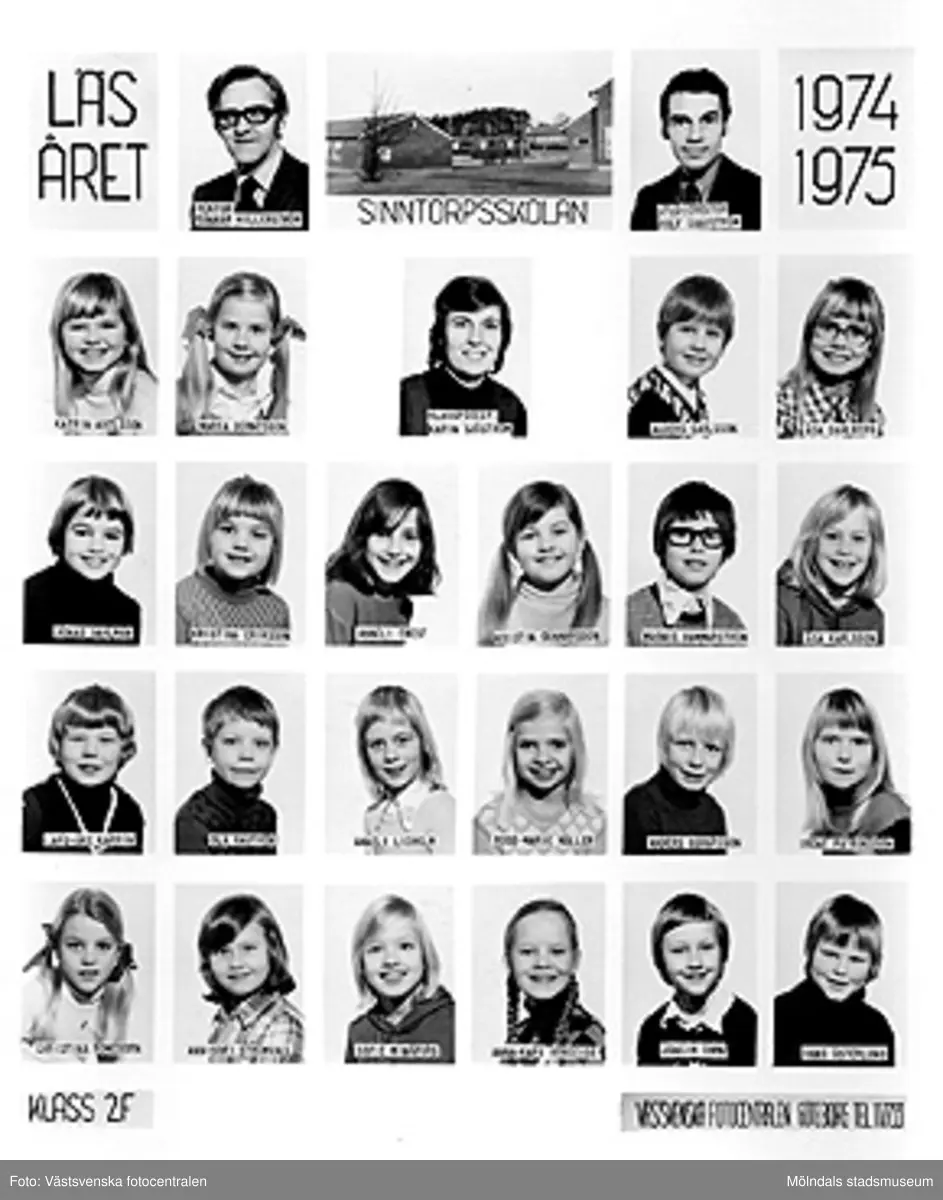 En bildkarta med skolfoton på klass 2F i Sinntorpsskolan, läsåret 1974/1975. Bildkartan är uppklistrad på ett fotoark i en pärm (MM23916) från Brattås rektorsområde, tillsammans med andra skolfoton MMF2004_1484-1522.