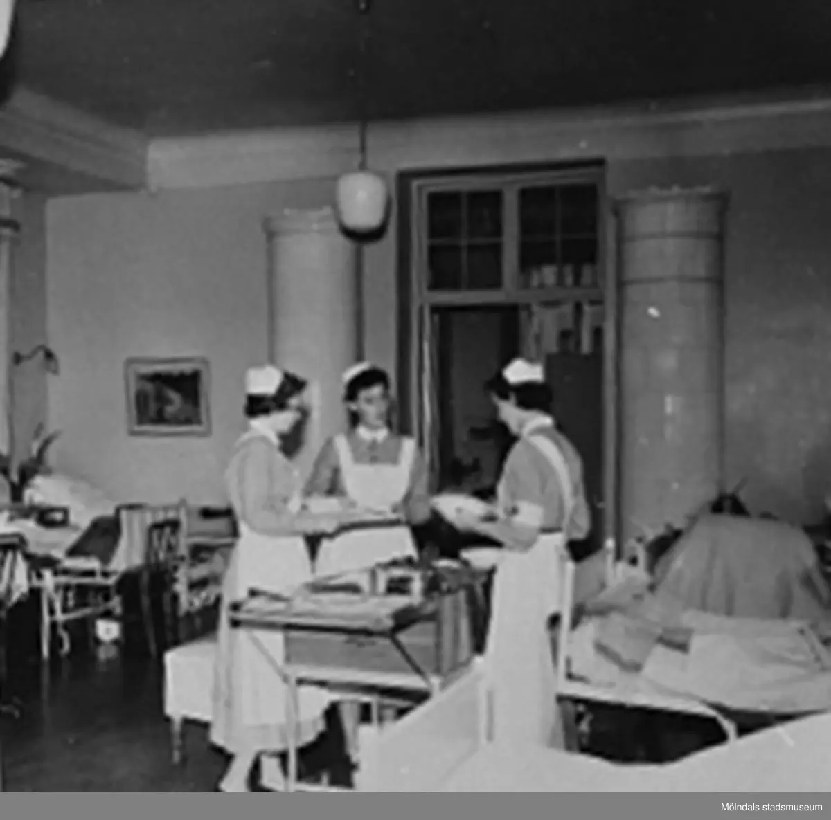 Tre sjuksköterskor delar ut mat på Sabbatsbergs sjukhus i Stockholm,