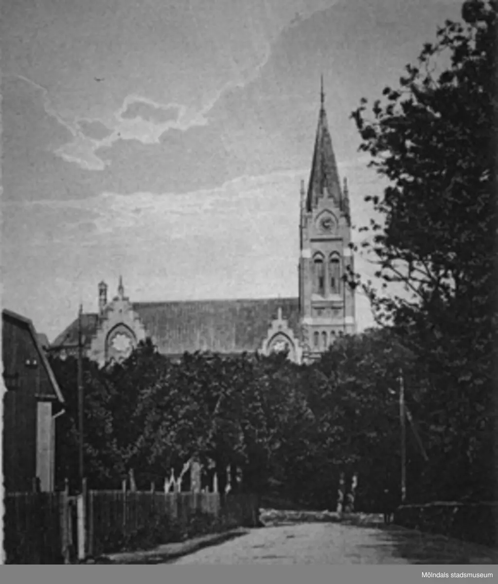 Fässbergs kyrka sedd från Frölundagatan, okänt årtal. Till vänster skymtar den gamla kyrkgrinden. Frölundagatan var på denna tiden mycket smalare än idag.