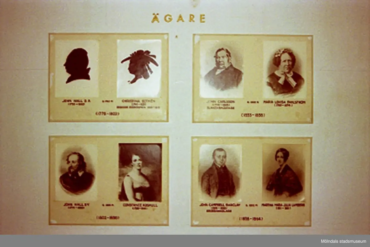 Utställning på Gunnebo slott, okänt årtal. John Halls eller Carlsbergs teckningar. Tidigare ägare till slottet.