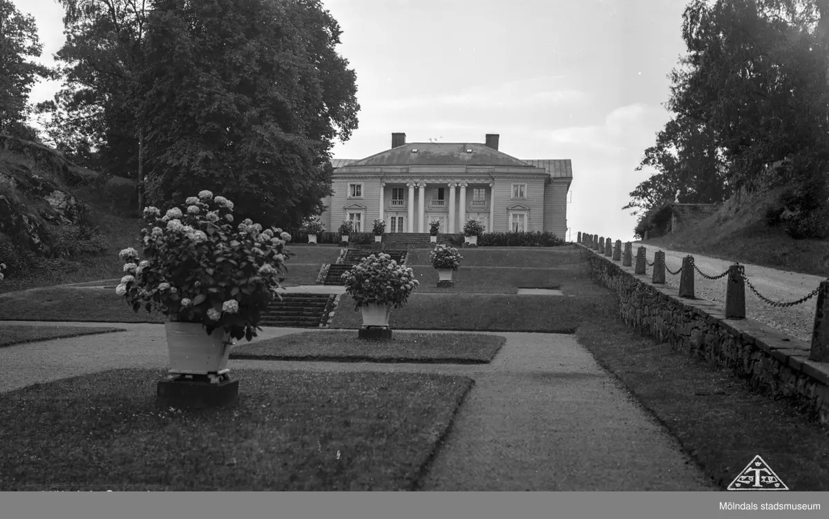 Gunnebo i Mölndal. Vy mot Gunnebo slotts norra fasad från Appareillen. Notera Sparrarnas fyrkantiga blomsterlådor med lejonfötter.
