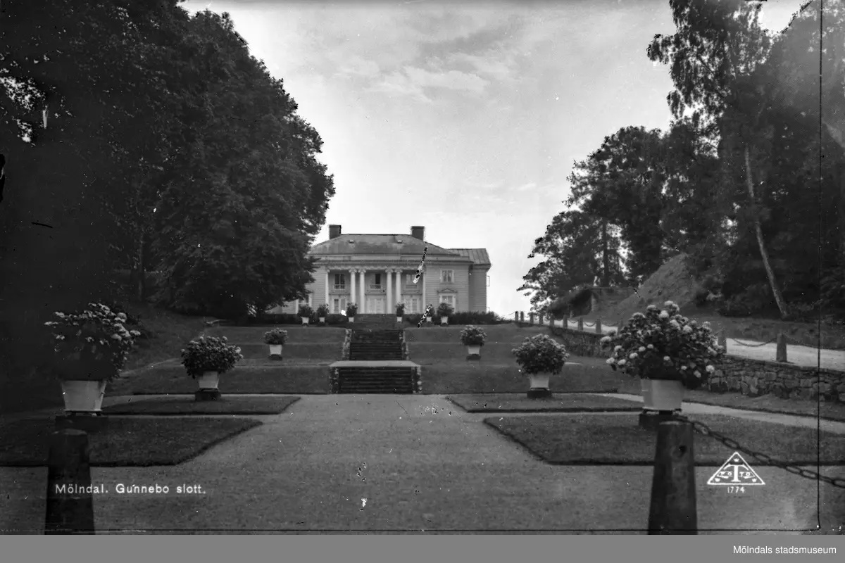 Gunnebo i Mölndal. Vy mot Gunnebo slotts norra fasad från Appareillen. Notera Sparrarnas fyrkantiga blomsterlådor med lejonfötter.