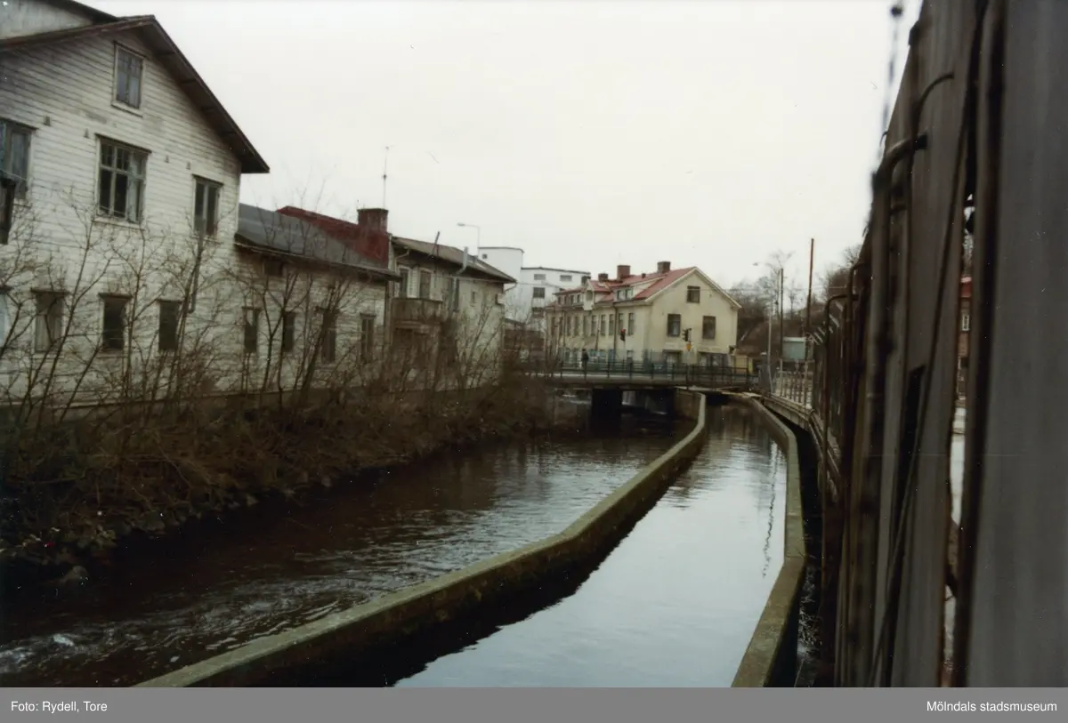 Vattenränna i Mölndalsfallen på 1970-talet. Till vänster ses huset Götaforsliden 1-5. I bakgrunden ses Forsebron och Kvarnbygatan 4.