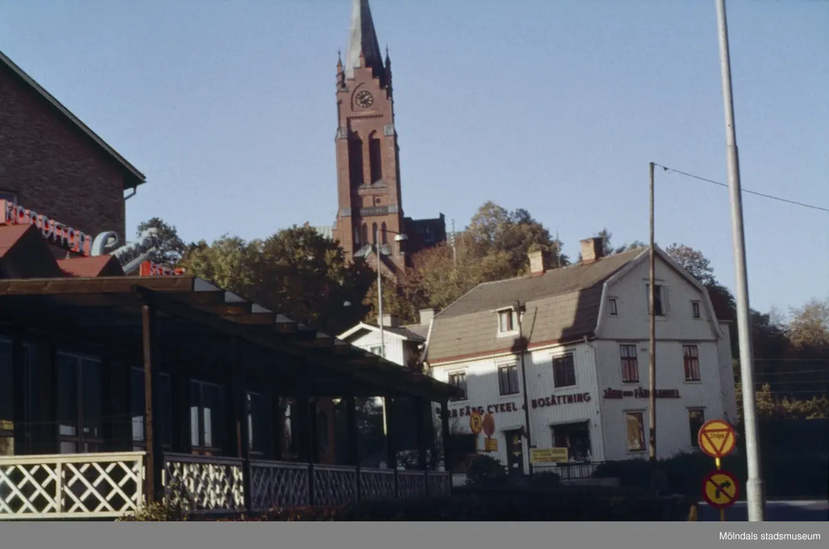 Vy från Storgatan i Mölndal på 1960-talet. Till vänster ses Gunnars konditori, till höger Joel Jakobssons järnhandel och i mitten Fässbergs kyrkas torn.