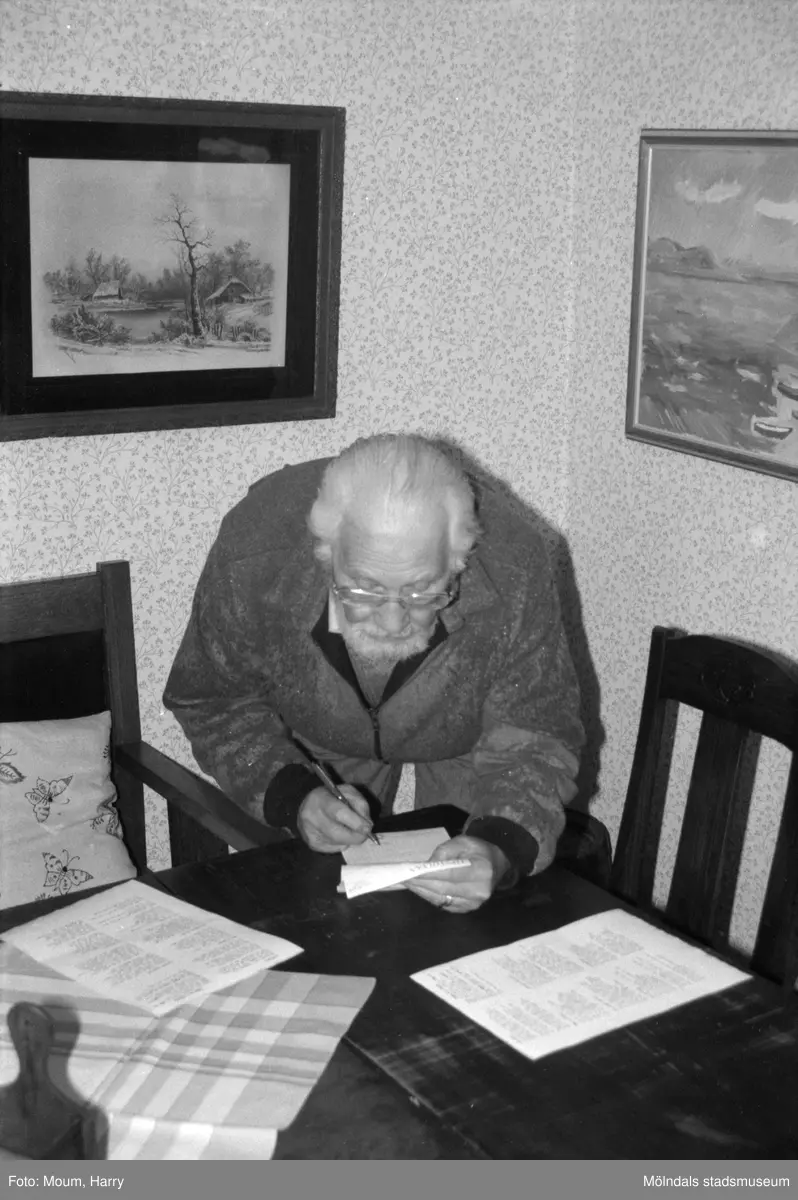 Bertil Edvardsson skriver anteckningar under gökottabesök på hembygdsgården i Långåker, Kållered, år 1985.