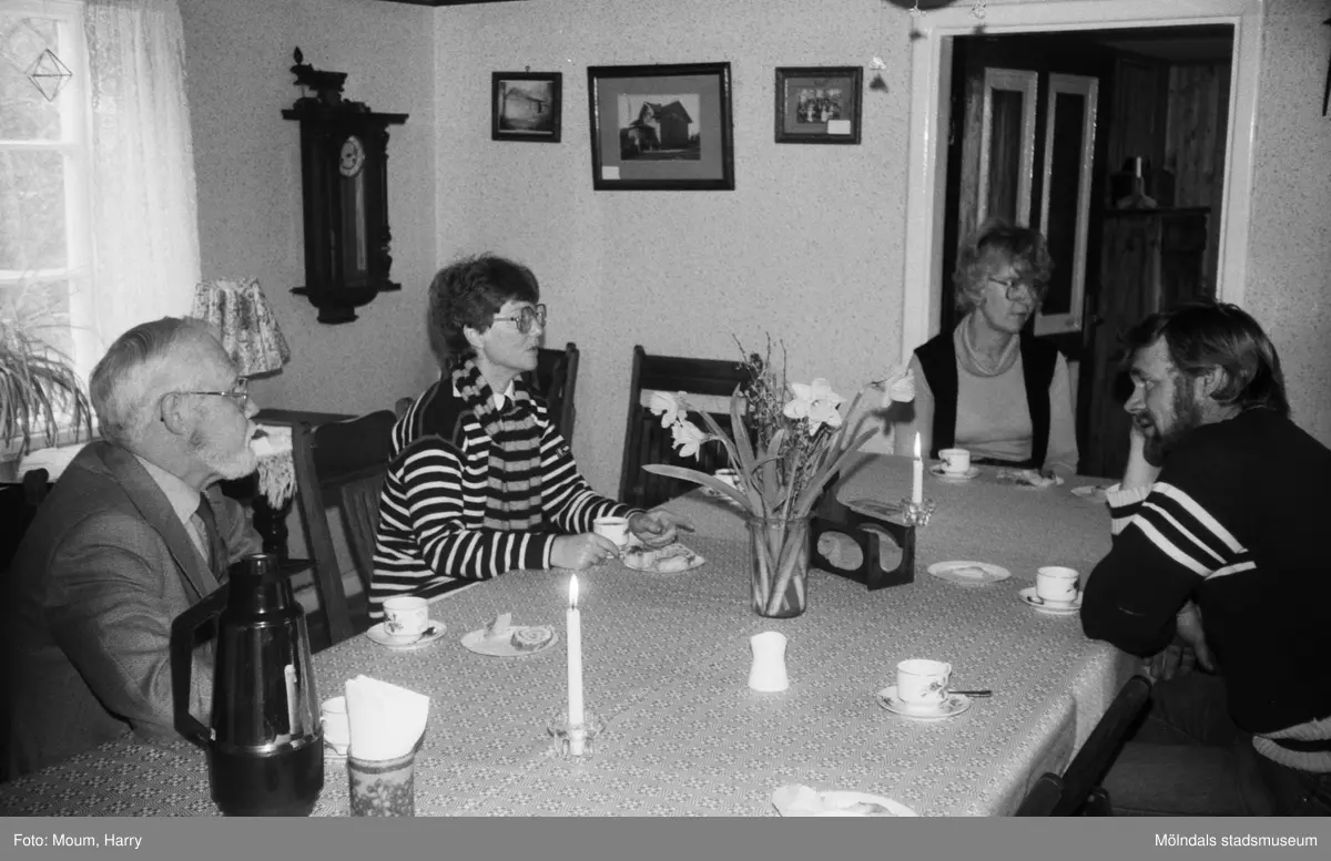 Från vänster: Bertil Edwardsson, okänd, Kerstin Moum och Jörgen Johansson sitter runt ett bord och fikar på hembygdsgården i Långåker, Kållered, år 1983.