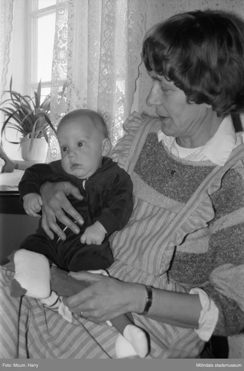 Karin Gustafsson, Långåker, med Johannes Lundin i knät. Söndagsträff på hembygdsgården i Långåker, Kållered, år 1985.