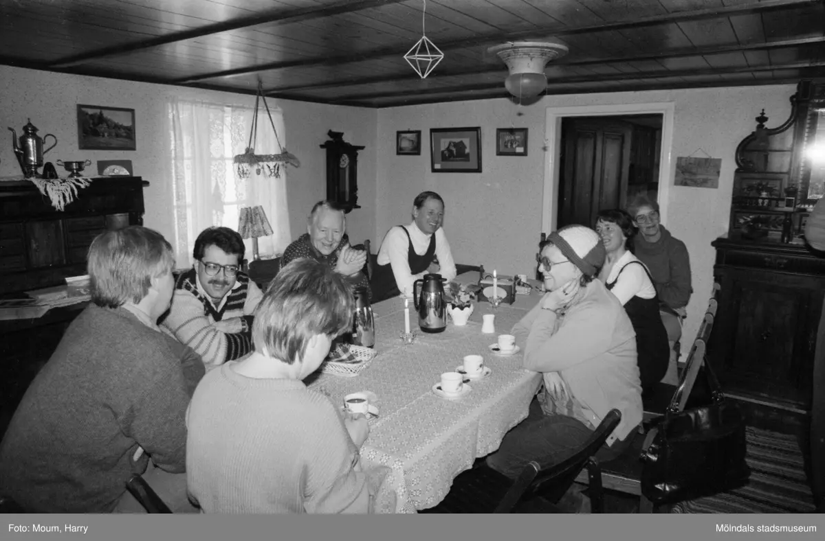 Söndagsträff på hembygdsgården i Långåker, Kållered, år 1985. "Visst är det skönt att komma bort från vardagsmiljön och koppla av i storstugan på Långåker."