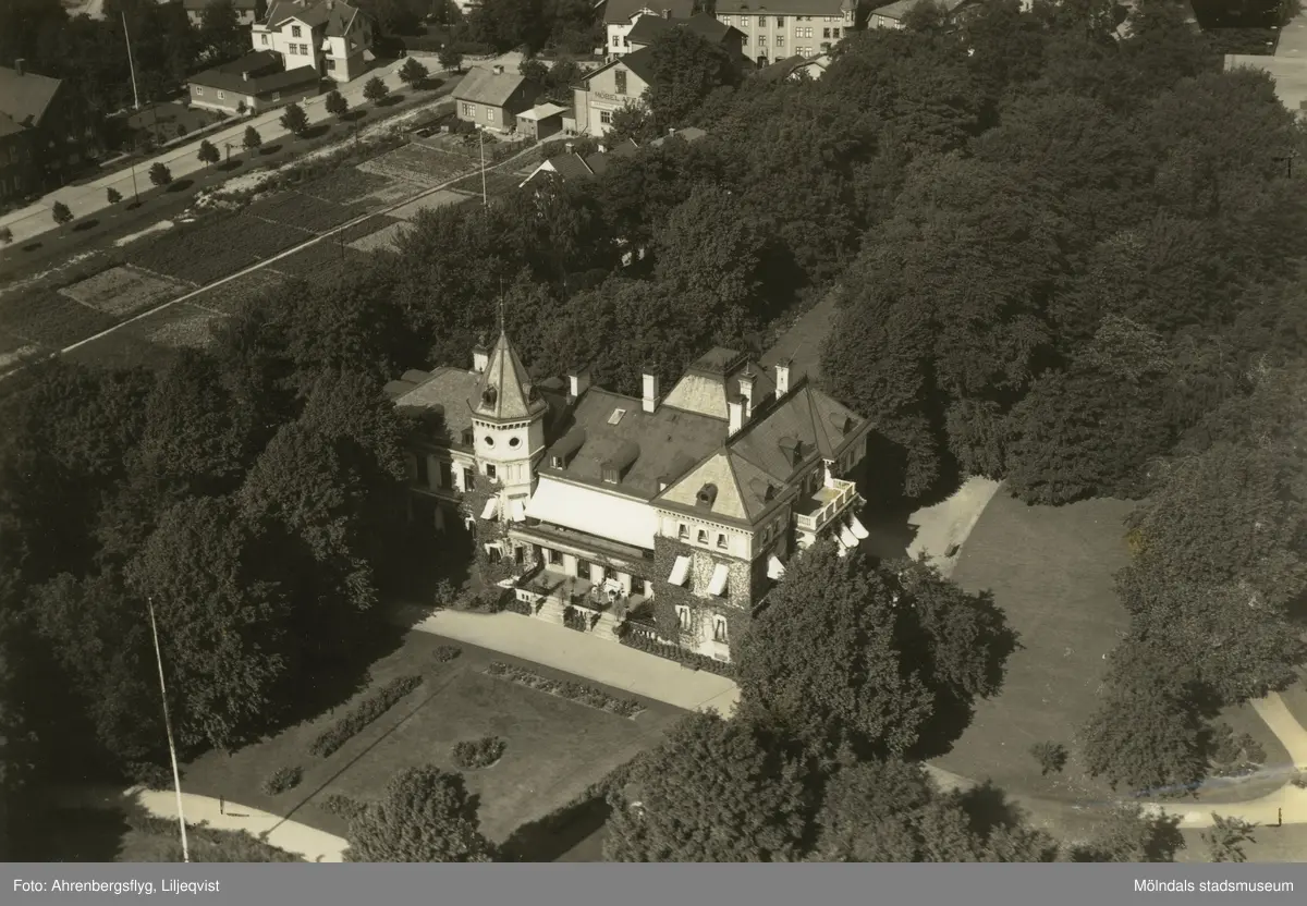Flygfoto över Villa Papyrus (senare: Villa Korndal) den 28 april 1942. I bakgrunden ses Allén och Trädgårdsgatan (senare: Störtfjällsgatan).