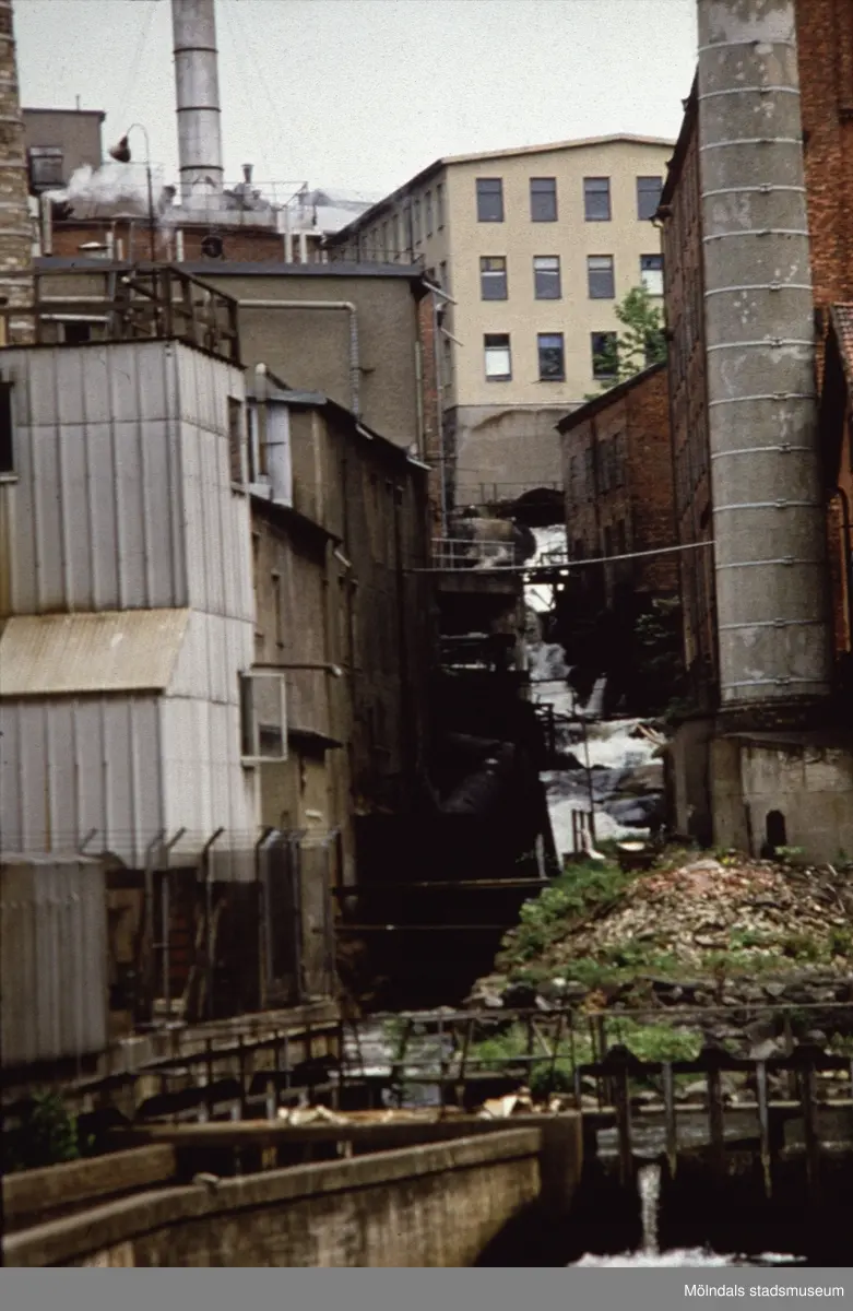 Kvarnbyfallet sett från Forsebron i Mölndal, 1970-tal. Den beige byggnaden i fonden är Ahlafors textilindustri/Carlsbergs Spinneri på Götaforsliden.
