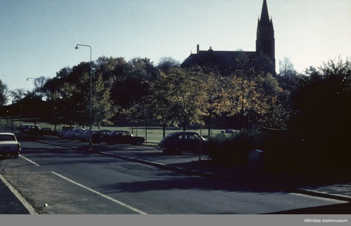 Bilar står parkerade på Häradsgatan i Mölndal, 1970-tal. Fässbergs kyrka tronar i bakgrunden.